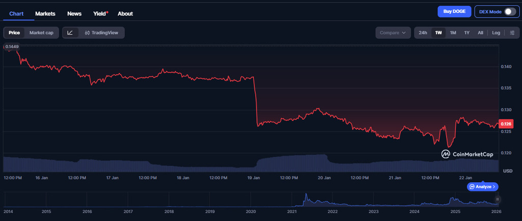 Although Dogecoin remains one of the most recognized meme coins, it has recently shown downward movement on the charts. CoinMarketCap data indicates that the Dogecoin price fell from around $0.14 to near $0.12 over the past seven days, representing a decline of more than 10% in that period.
