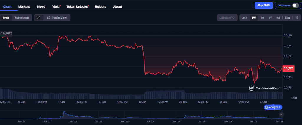 Shiba Inu has also shown price declines recently. On the one-week chart, CoinMarketCap data shows the price of SHIB falling from about $0.0000085 to nearly $0.0000075, a drop of close to 10%.