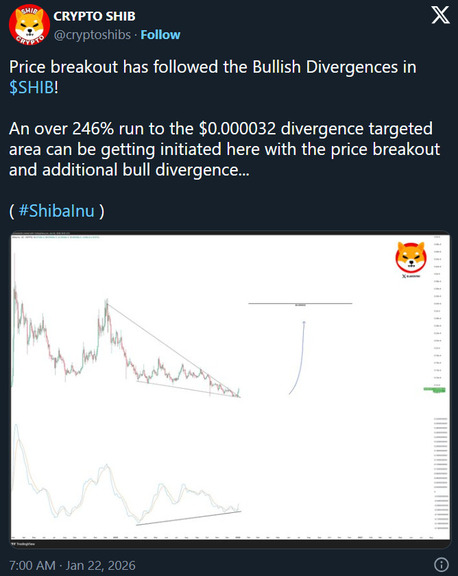 Some traders remain bullish due to a Shiba Inu price forecast shared by influencer Crypto Shib. In a post on X, the influencer suggested that a bullish divergence could indicate a potential upward move, forecasting a target near $0.000032.