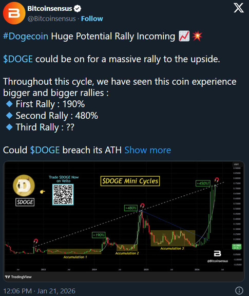Some market observers, including influencer Bitcoinsensus, have suggested that an upswing could occur after the current accumulation phase. In a post on X, the influencer referenced past cycles and forecasted a potential rise in the Dogecoin price to around $0.75.
