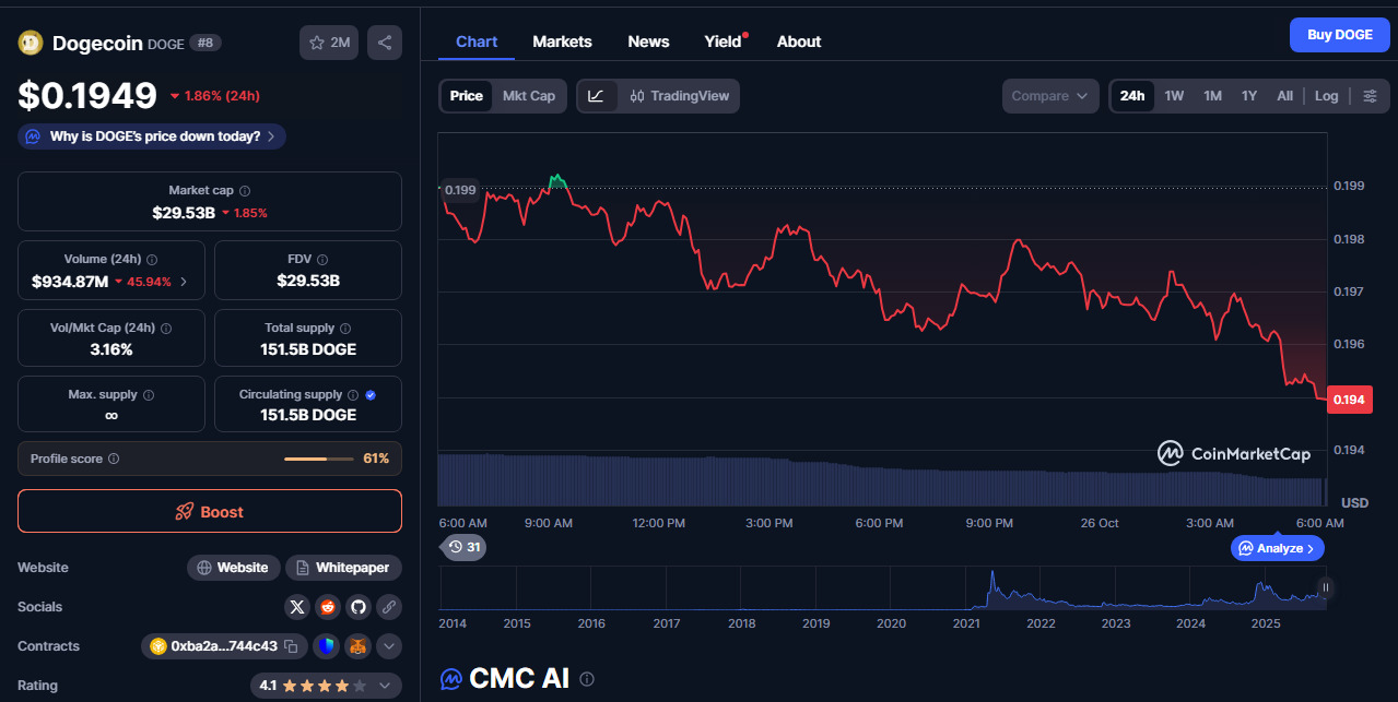 Dogecoin (DOGE) is now trading at $0.1977 with a market cap of $29.97 billion, supported by institutional investment such as the REX-Osprey ETF. Nevertheless, CoinCodex predicts a 2025 peak of only $0.2971 — nowhere near a 10x rise. It has an unlimited supply, and the hype cap of its meme-coins sits around 50 percent. Technical indicators show neutral momentum, while utility tokens are preferred over meme coins in the current altseason, restricting Dogecoin’s growth.