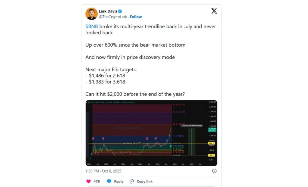 On the downside, the $1,264 level offers support. On the other hand, analysts expect more of an uptrend in the long run. According to Lark Davis, the Binance Coin price has risen by about 600% since July. The analyst noted that the DeFi coin is currently in discovery mode and could climb to $1,486 and then $1,983.