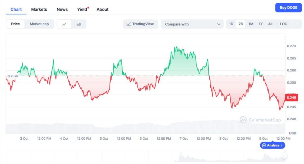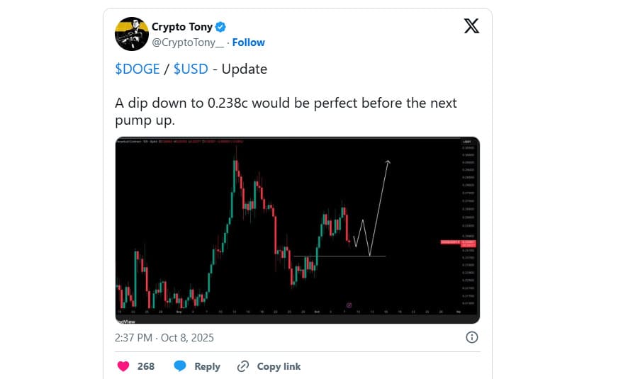 Meanwhile, Crypto Tony argued that the Dogecoin price has to drop to $0.238 first. Afterwards, the analysts said the DOGE price could soar to $0.30.