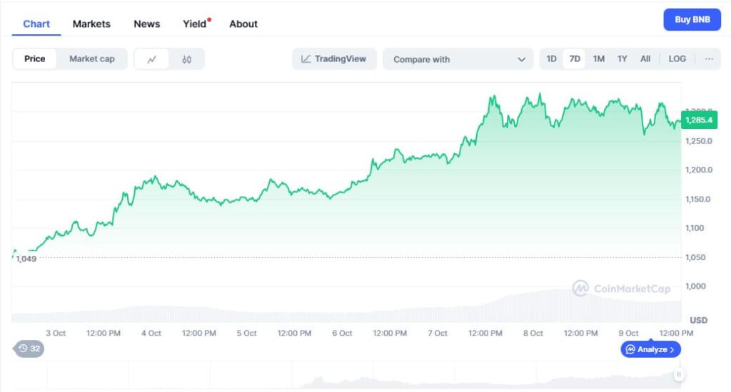 The Binance Coin price has been on an upward trend over the last one week, rising above key price levels. It recently hit a peak of $1,336 and then dropped back to below $1,300. Although the BNB price has lost some of its gains, it remains one of the best performers.