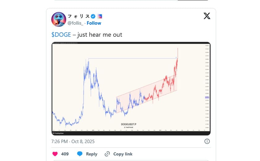Its histogram is showing green bars, confirming that momentum is moving to the upside. A trader, Follis, forecasts that the value of Dogecoin might rise to $0.48. According to him, the memecoin trades inside a rising channel and could hit this target if buying pressure continues to increase.