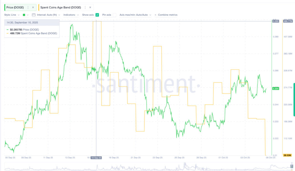 The Spent Coins Age Band, which measures how many old coins are being moved, dropped sharply from 486.7 million DOGE in mid-September to just 58.5 million by October 6. This means fewer people are taking profits, and most are holding for more gains.