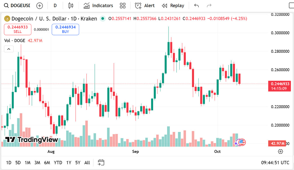 Dogecoin (DOGE) is currently selling at $0.2447, following a significant loss of 2.05% in the past day. Its market capitalization stands at $36.94 billion, while daily trading volume has fallen to $3.14 billion, down 23.6%.