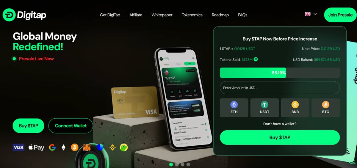 A buyback and burn system gradually reduces circulating supply, creating scarcity over time. What truly sets Digitap apart is its positioning as the worldās first omni-bank. The project integrates Visa, Apple Pay, and Google Pay, while offering multi-currency IBAN accounts for global transfers.Ā