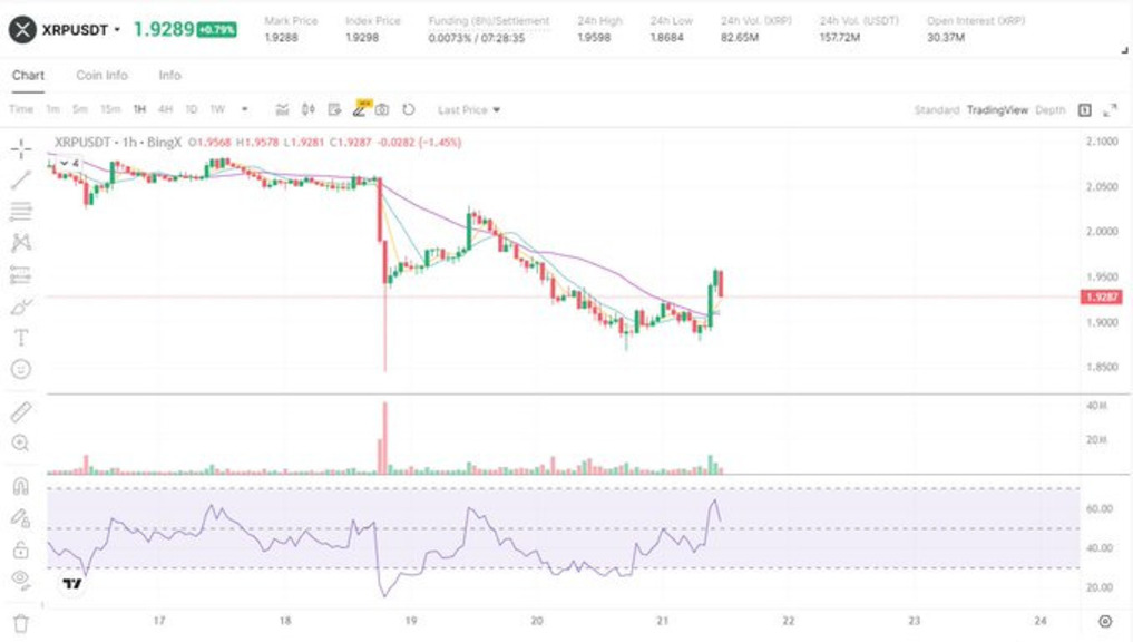 Los datos recientes de negociación sugieren que XRP está entrando en una fase de consolidación más que experimentando una reversión decisiva. El volumen de trading ha aumentado alrededor de un 10%, hasta aproximadamente $3.27 mil millones, mientras que la acción del precio se ha estabilizado cerca del nivel de $1.90 tras un retroceso gradual.