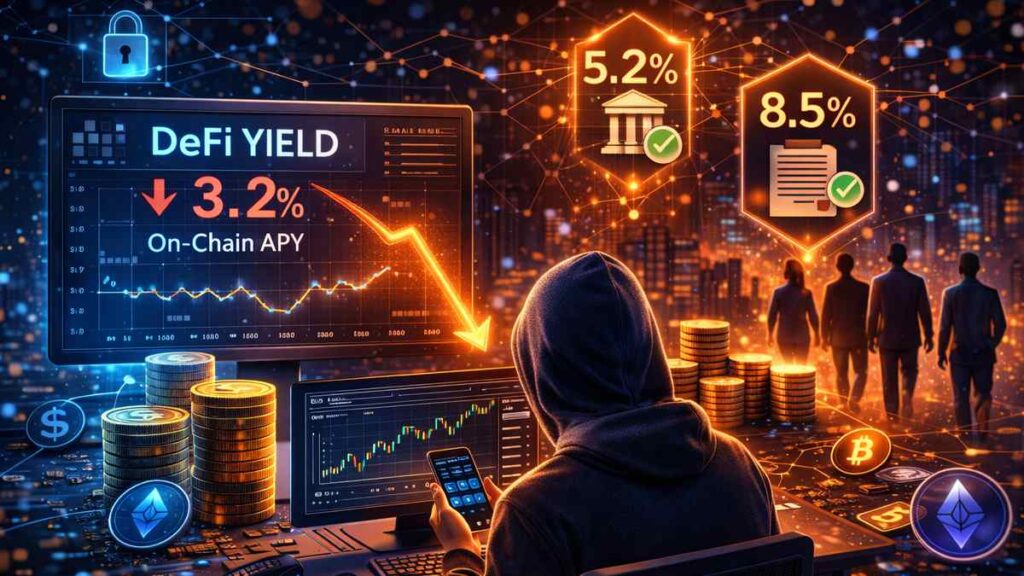 En los primeros meses de 2026, una persona que deposita dólares digitales en el principal protocolo de préstamos de Ethereum recibe una tasa anual cercana al dos coma seis por ciento. Ese mismo usuario puede abrir una cuenta de ahorros en un banco tradicional de Estados Unidos y obtener un tres coma catorce por ciento sin riesgo de que un fallo en el código informático le quite sus fondos.
