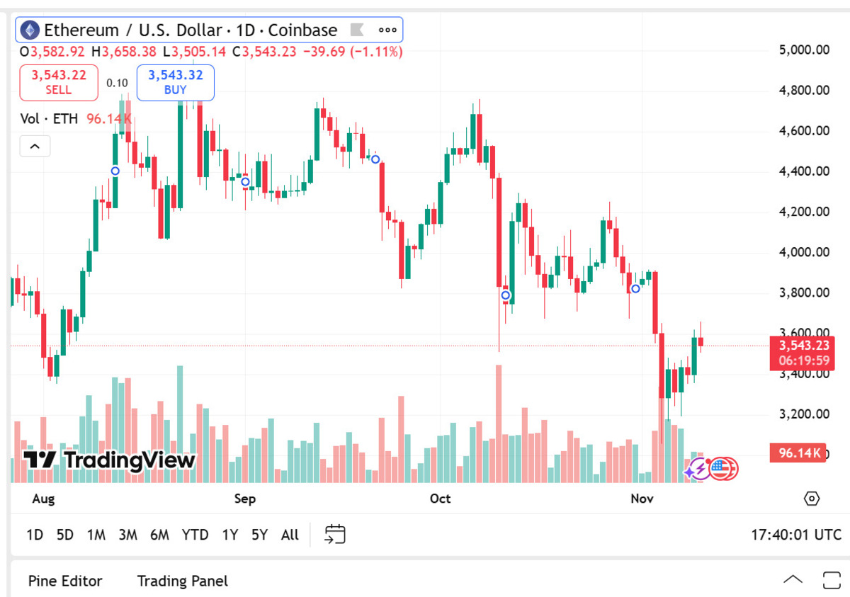 En el momento de redactar este artículo, Ethereum se cotiza a 3543 dólares, respaldado por una capitalización de mercado de 424 840 millones de dólares y un volumen de negociación en 24 horas de 34 960 millones de dólares, lo que representa un aumento del 31,81 %.