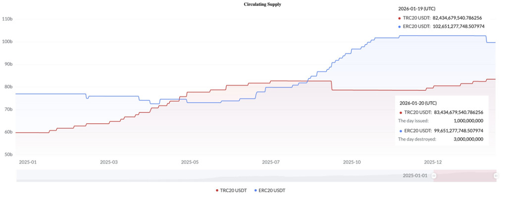 El 19 de enero de 2026, USDT en Tron (TRC-20) registró 82,434,679,540 tokens. Un día después, el 20 de enero, la cifra saltó a 83,434,679,540. El cambio representa +$1,000 millones de USDT en un solo día mediante una acuñación directa en Tron.
