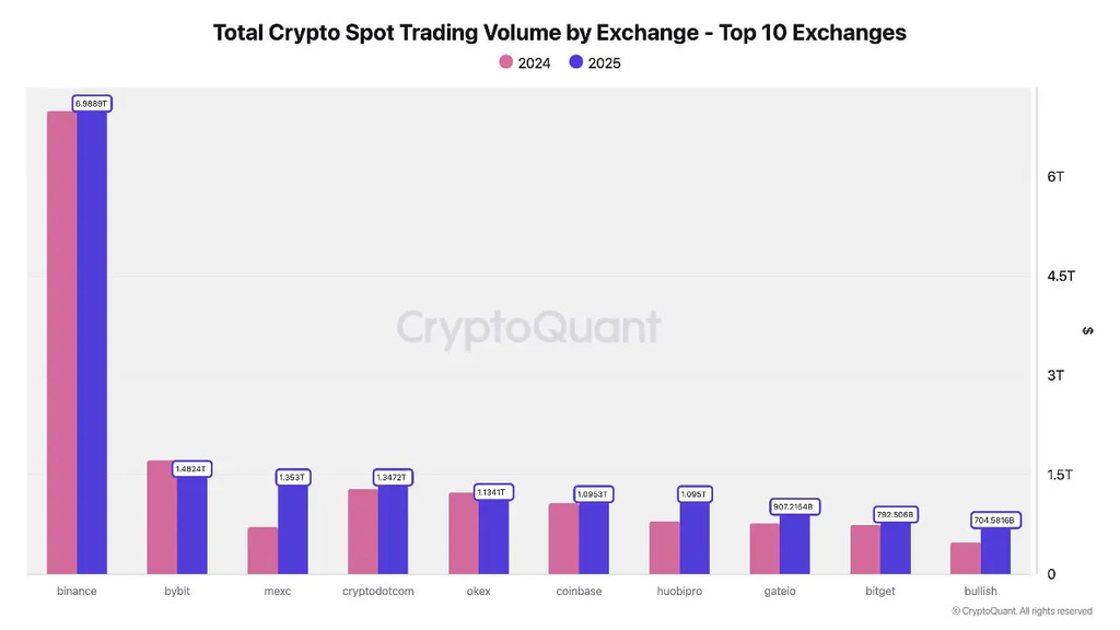 El trading spot también mostró alta concentración. Binance reportó 7 billones de dólares en este segmento, el 41% del volumen de las diez exchanges más grandes. Su dominio abarcó activos como ETH, XRP, BNB, TRX y SOL. Competidores como Bybit, MEXC y Crypto.com operaron a distancia, cada uno con volúmenes entre 1,3 y 1,5 billones de dólares.