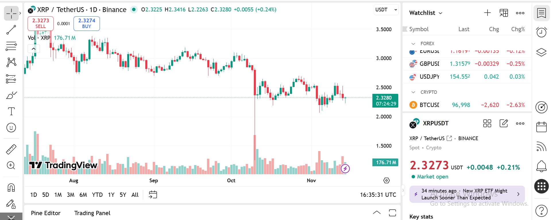XRP cuenta con una capitalización de mercado cercana a los 140 000 millones de dólares y un volumen de negociación en 24 horas superior a 8 000 millones de dólares, lo que refleja una liquidez sólida mientras el precio se estabiliza. Desde la cotización del ETF, XRP se ha movido entre 2,30 y 2,35 dólares, mostrando pocos beneficios inmediatos por las entradas.