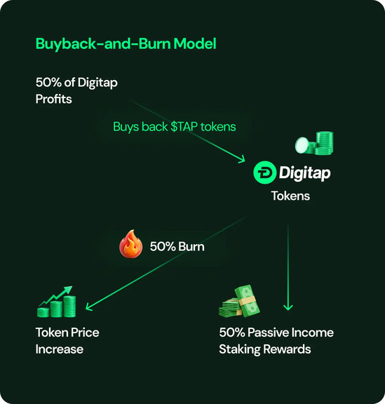 Therefore, as Digitap grows, the system buys back $TAP at market prices daily and burns those tokens. It means that more usage results in more buy-backs, which leads to more burns. More burns reduce supply, which causes higher price growth potential.