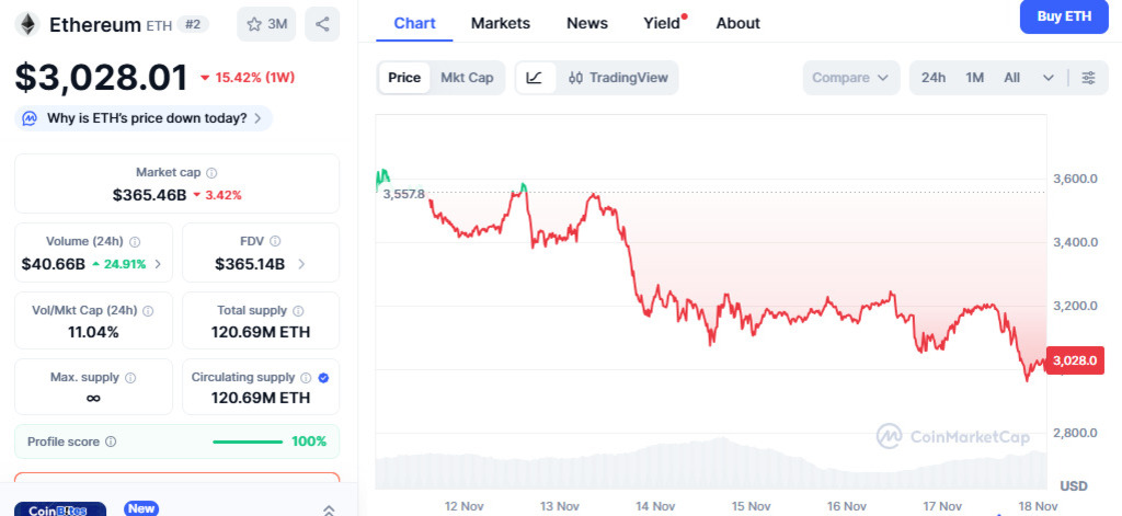 Currently in a downtrend, will the Ethereum price rebound? Currently, ETH is trading around the $3,000 support. Bulls losing this level may lead to a retest of lower support zones, possibly $2,500.