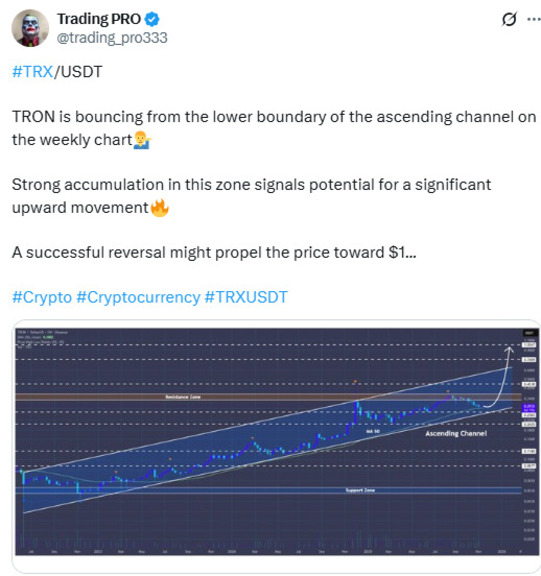 Given the above, the TRX coin may not be the best crypto to buy now, although it is a good pick for modest gains. For Trading PRO, a crypto analyst on X (formerly Twitter), TRON is in a strong accumulation zone and could reach $1 upon a successful reversal.