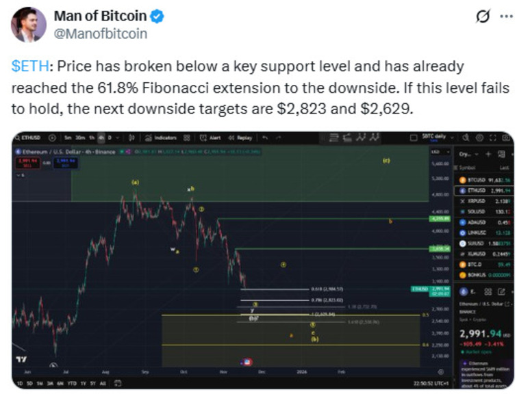 Man of Bitcoin, a top analyst on X, shares a similar sentiment. After identifying a break below a key support level, they believe the next targets are $2,820 and $2,629 if the Ethereum price fails to hold this level. Based on their forecast, ETH isn’t among the most promising altcoins to buy in 2025.