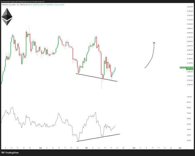 The structure aligns with bullish divergence patterns identified by analyst Javon Marks, who projects a breakout beyond $4,811 could open the path to $8,000. Ethereum’s steady support around $3,700 also confirms continued accumulation among long-term holders.