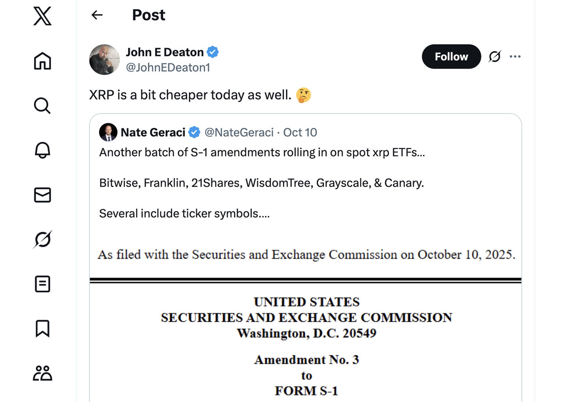 Pro-XRP lawyer John Deaton commented that XRP is āa bit cheaper today,ā implying that the current price might be a good entry before spot ETF listings.Ā