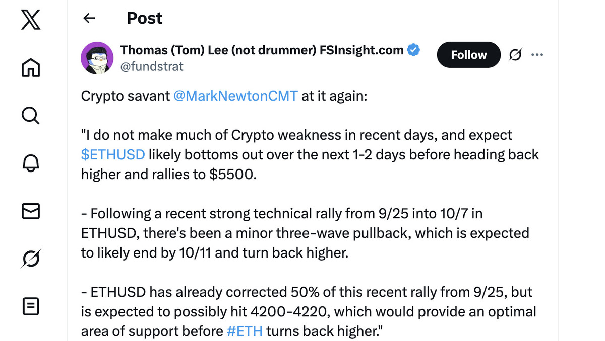 The asset dropped below $4,300 last week but recovered to around $4,400. According to Fundstratās Mark Newton, Ethereum has already corrected from its September run and is now entering a new upward phase. He said dips at this stage look like buying opportunities rather than signals of weakness.