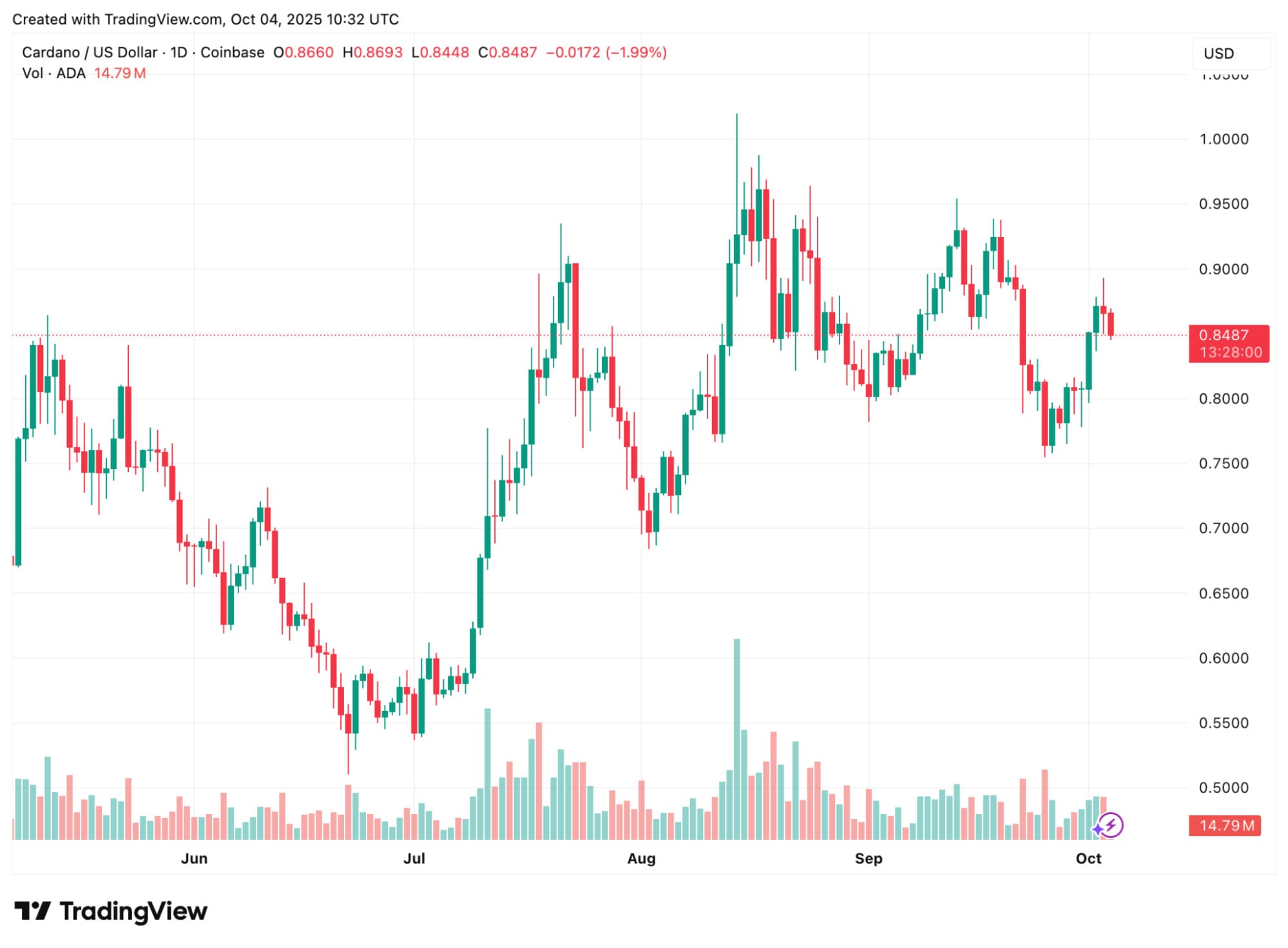 Cardano (ADA) is currently trading at $0.8488. Grayscale’s Cardano ETF decision is expected by late October 2025, depending on SEC feedback. ADA is trading above its 50-day moving average, with a potential rise to $1.02 if resistance breaks.Ā