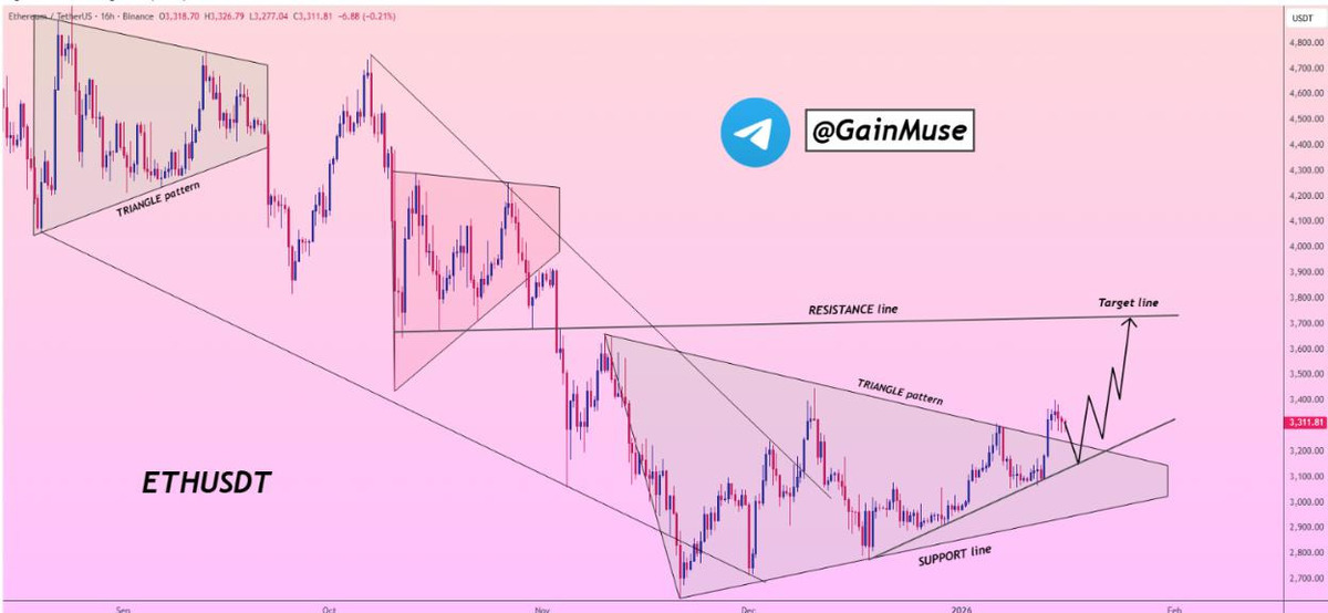 Technical analysis suggests Ethereum is rebounding from long-term support levels, forming an ascending triangle within a broader range. The structure indicates that ETF-driven capital may be supporting steadier price behavior rather than speculative excess.