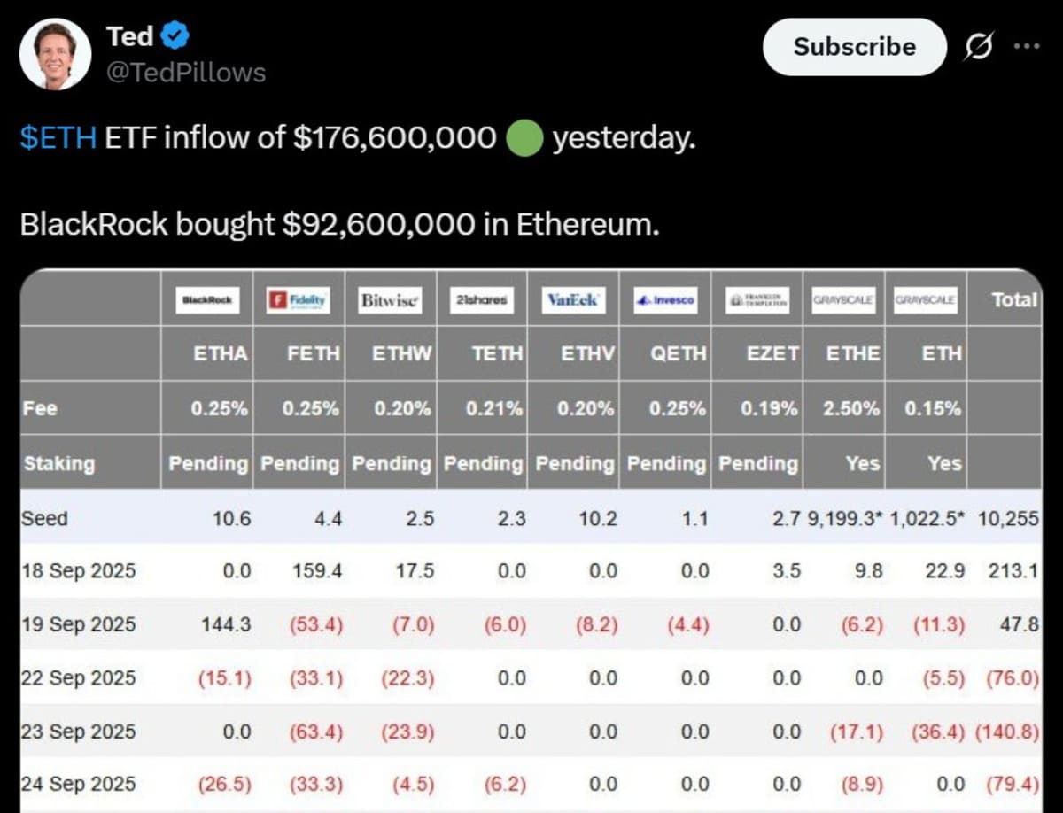 Ethereum has gained attention following inflows of 176.6 million ETFs in a single day. BlackRock was on the frontline with an amount of $92.6 million, which indicated an increase in institutional confidence towards the long-term prospects of ETH. This inflow increase highlights the role of Ethereum as the institutional digital asset of choice other than Bitcoin.