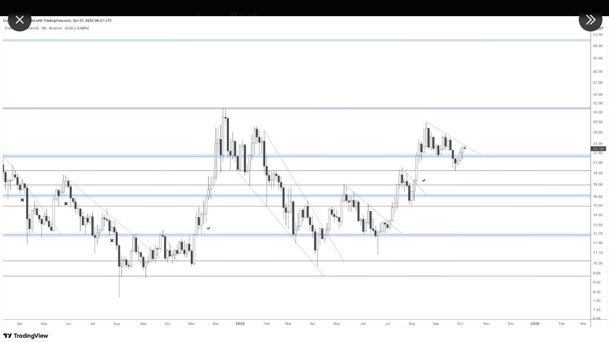 Meanwhile, Chainlink continues its steady climb, outperforming most peers amid growing network adoption. The LINK/USD pair recently crossed $22, and analysts see room for further gains toward the $25–$27 range amid bullish reversal.