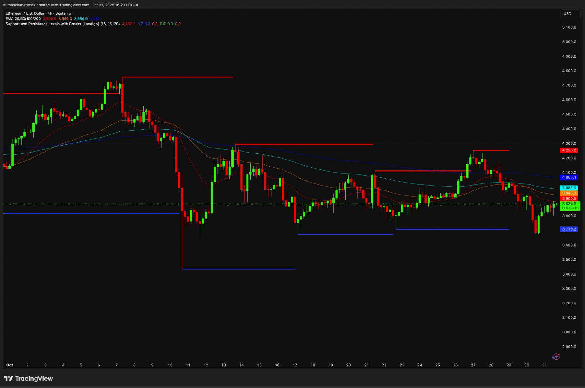 On the charts, ETH trades at $3,884. It’s still below its 50-day EMA ($3,949) and 200-day EMA ($4,069). That’s a classic sign of hesitation before any major price rally.