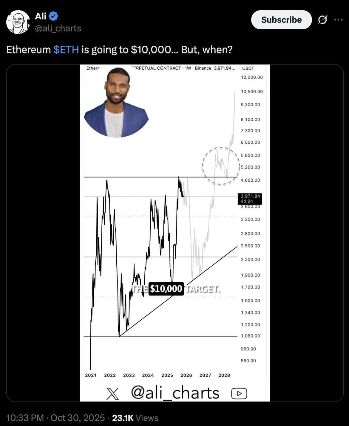 $10,000 on the price charts is where most Ethereum holders are looking. But analyst Ali Martinez thinks Ethereum could first dip to $2,000 before rushing towards the ambitious target.