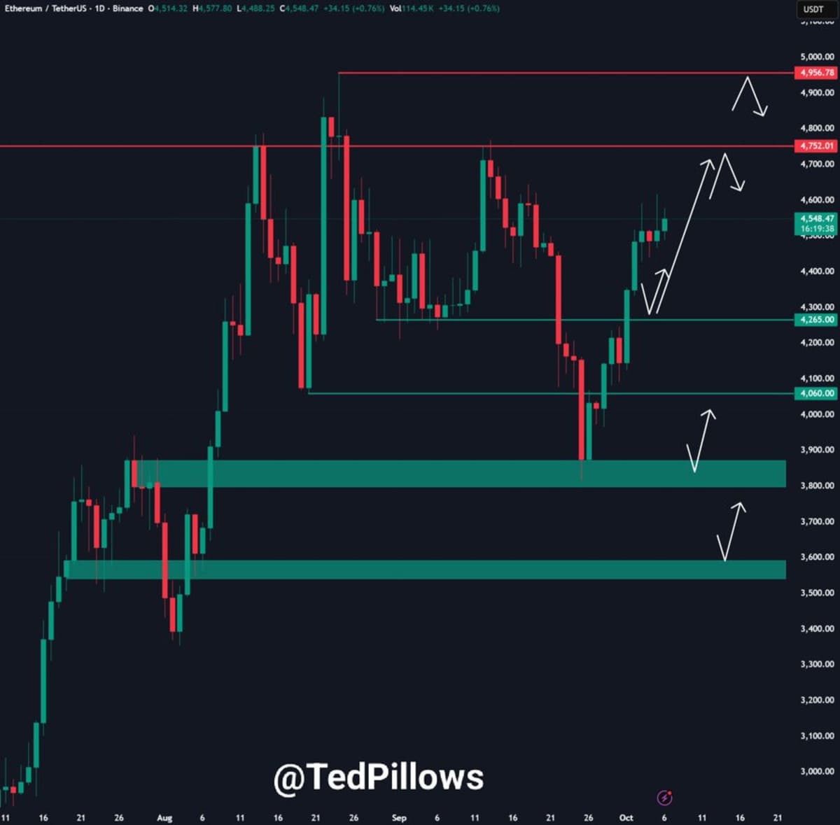 Ethereum’s gradual rise towards $4,600 supports the recovery of market momentum. Analysts predict a move above $4,700, which could lead to $5,000 soon.