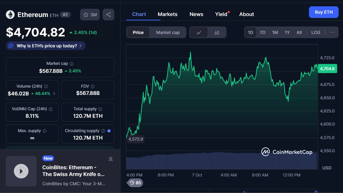 The crypto market is bouncing back as investors are moving back into high-performing assets. Ethereum (ETH) leads the recovery with a strong touch at $4,700, after a week of strong inflows and renewed institutional demand. Analysts have noted that the liquidity rebound, coupled with the rise in ETF behavior, is providing renewed investor confidence across major asset classes.