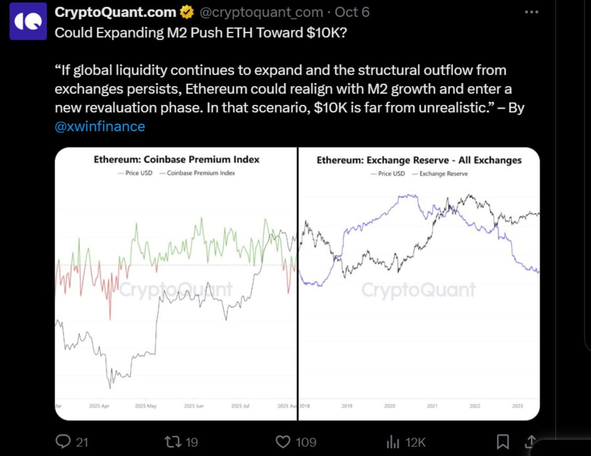 Ethereum is testing $4,700 on its recovery in October, showing fresh momentum. Analysts from XWIN Research believe that ETH could move to $10,000 if liquidity growth continues. They noted that the M2 money stock has grown for three years, and it has fueled demand for digital assets.