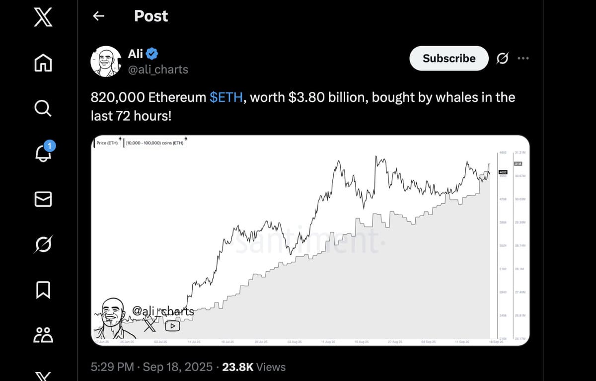 Alongside ETF demand, whale wallets have also been active. In September, more than 820,000 ETH ā worth around $3.8 billion ā was accumulated by large holders within 72 hours, according to analyst Ali Martinez.Ā