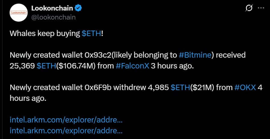 Chain analysis reveals that the newly found ETH was moved out of FalconX into wallets associated with BitMine.This marks one of the largest corporate treasury transactions in recent weeks. The firm now controls about 2.19% of Ethereum’s circulating supply, a concentration unmatched in the market.