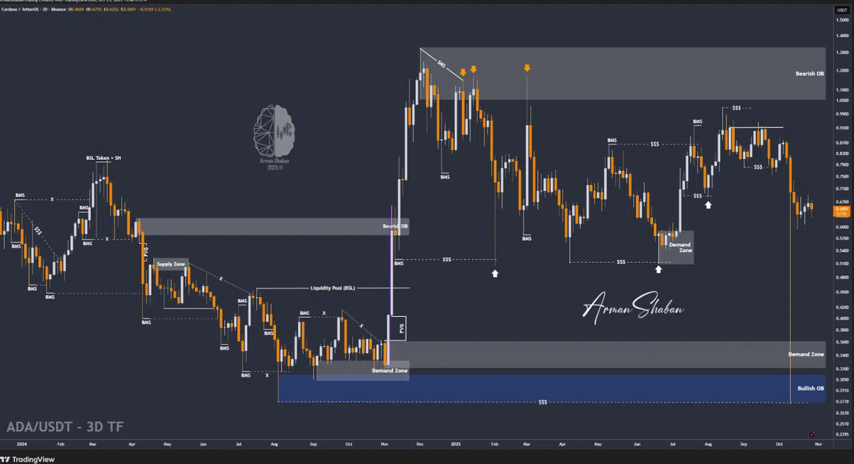 Cardano price updates show ADA around $0.605 with two zones that matter. The main demand band sits near $0.55, while the confluence area near $0.64 acts as a springboard. Cardano price updates from multiple analysts highlight $0.70 as the first gate, then $0.75, $0.85, and $1.00. The $0.75 to $0.78 region aligns with a key Fibonacci mark and is the breakout band to watch.