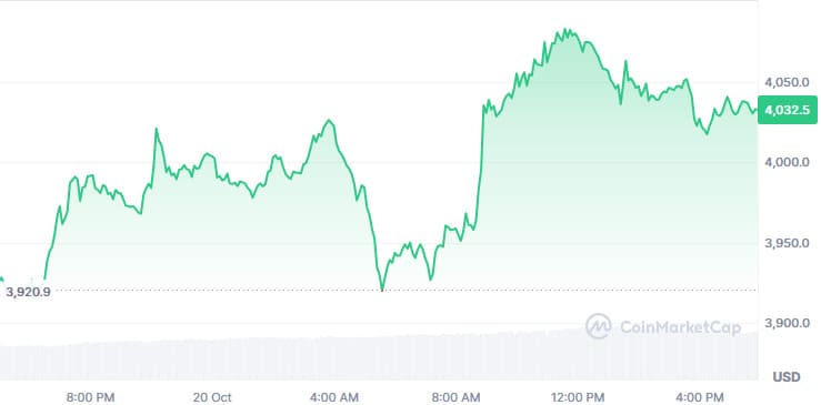 Ethereum continues to dominate the blockchain economy with a current price of $4,039.79, a market cap nearing $487 billion, and 24-hour trading volume above $39 billion. Over the past day, Ethereum has risen 4.64%, stabilizing after a volatile week that saw minor pullbacks. Despite short-term corrections, Ethereum’s one-year performance remains staggering, a 52.63% increase, proving it remains the bedrock of decentralized applications and financial innovation.
