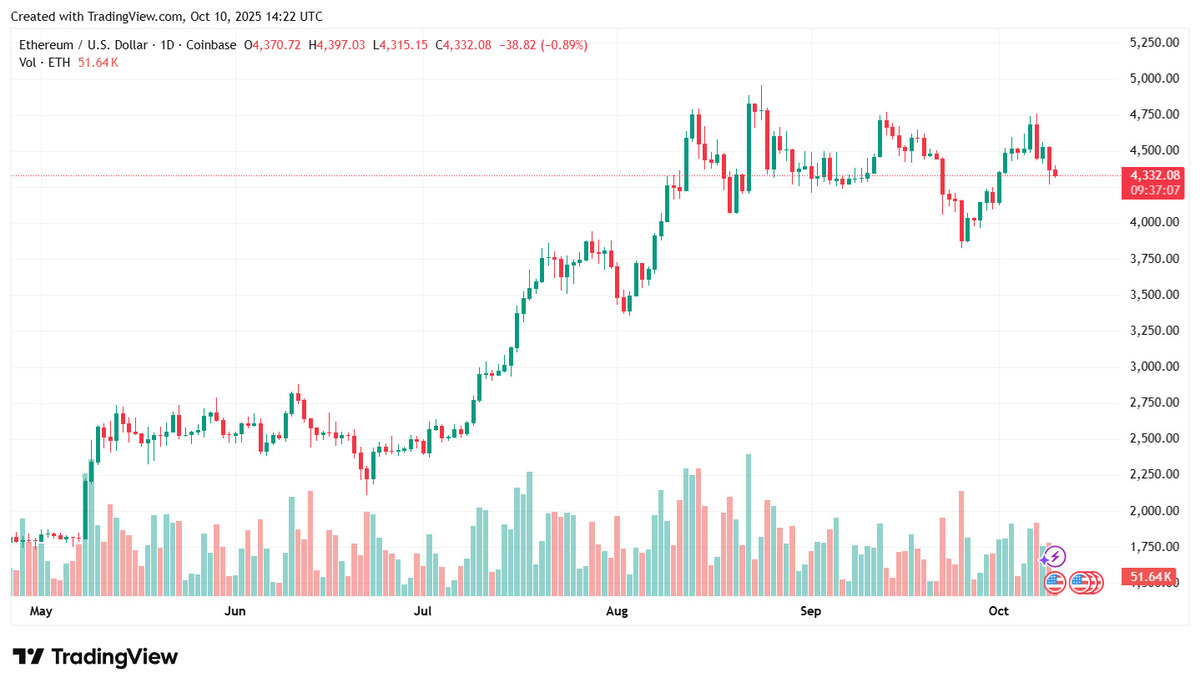 Ethereum price action is holding steady near $4,332 after a slight dip, with trading volume showing over 51K ETH exchanged today. Analysts predict ETH will range between $4,326 and $5,206 this October, with an average target near $4,763. This suggests short-term consolidation before stronger momentum kicks in by December.
