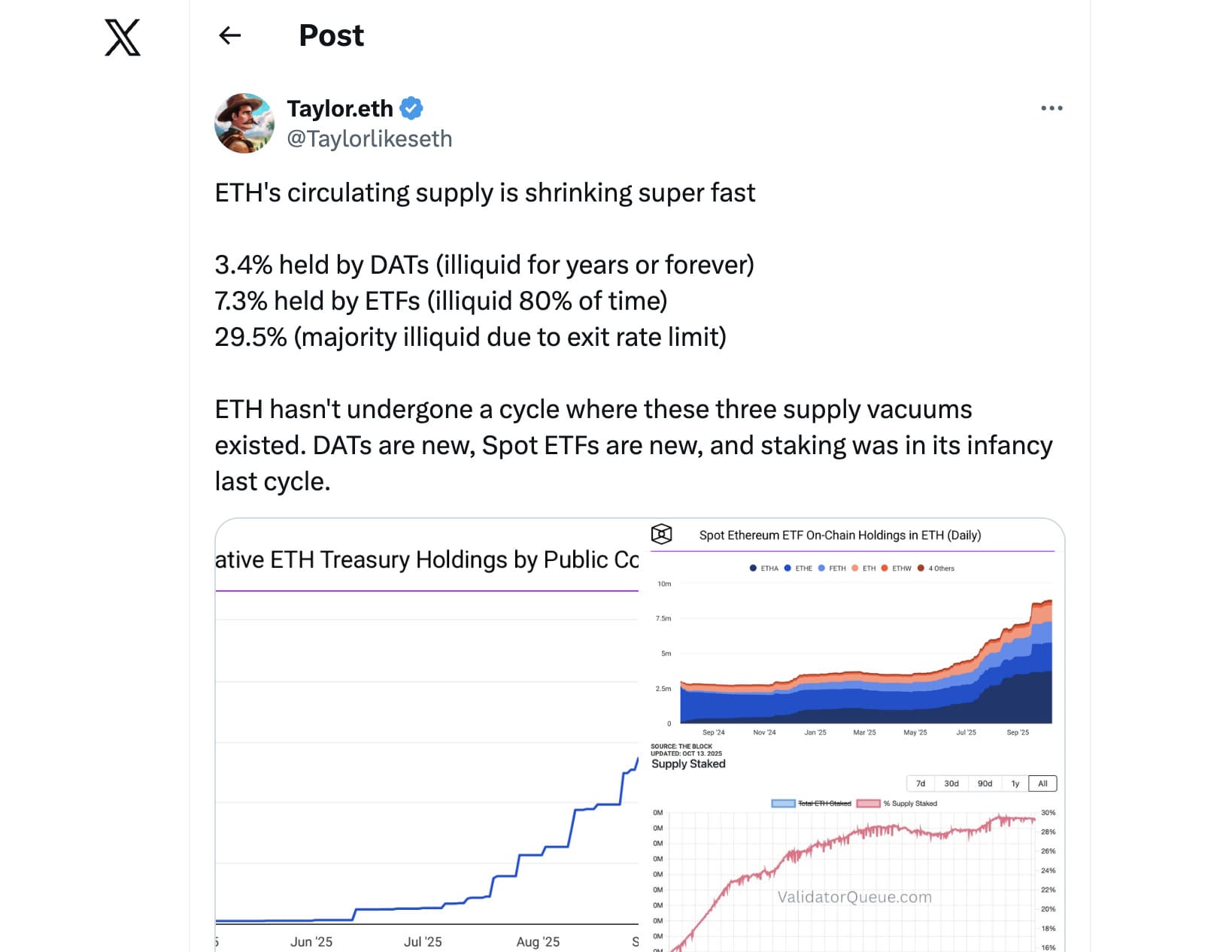 Ethereum’s setup looks explosive. Analyst Crypto Gucci says ETH is entering a rare stage where three supply vacuums are active at once — staking, ETFs, and long-term treasuries locking up tokens. Around 40% of Ether is now off the market, the highest in its history.