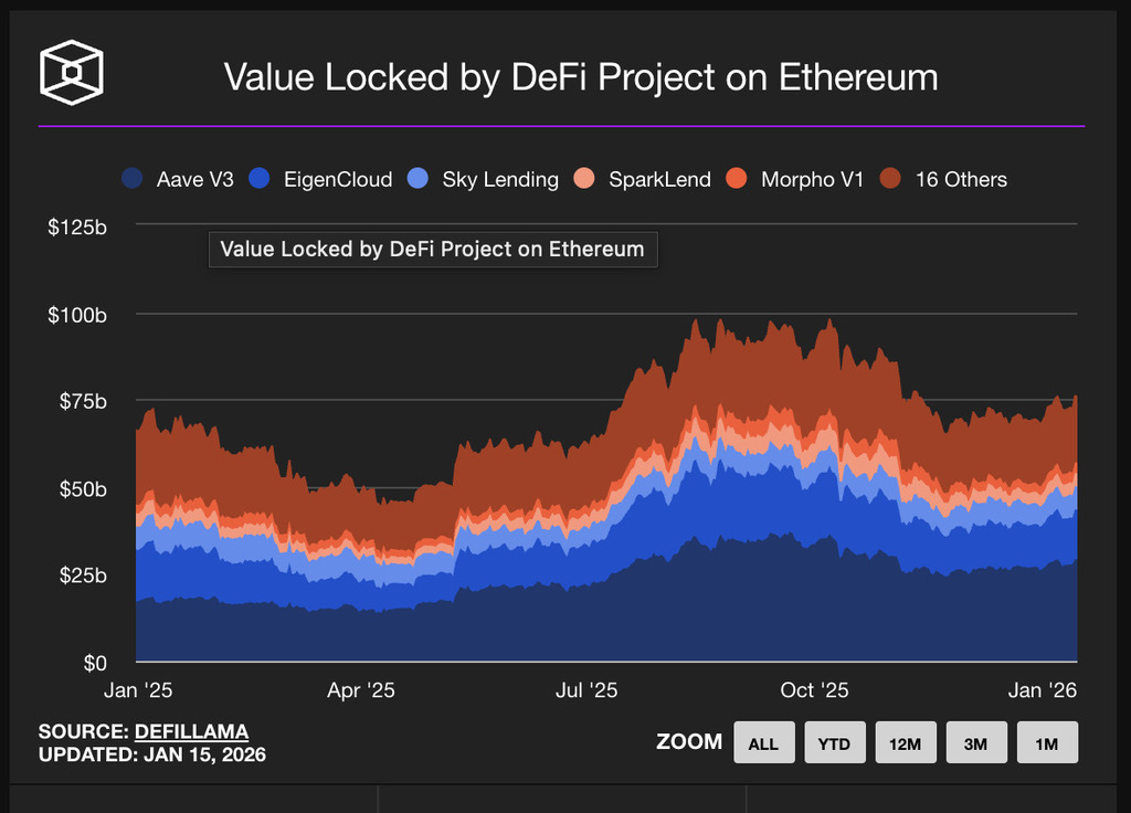 Ethereum continues to serve as the largest base layer for decentralized finance, with approximately $74 billion in total value locked, though this remains below the $106 billion peak reached in 2021. Meanwhile, daily active addresses have nearly doubled since that period.