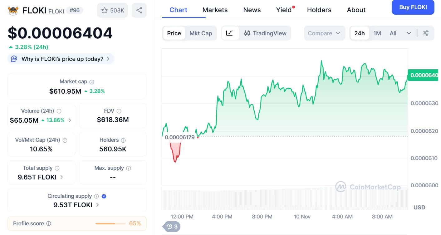 As of today, Floki crypto price is hovering around $0.00006403, down about 5% from last week’s levels. The meme coin’s market cap now stands at nearly $1.6 billion, but trading volume continues to decline, a sign that speculative interest may be shifting elsewhere.