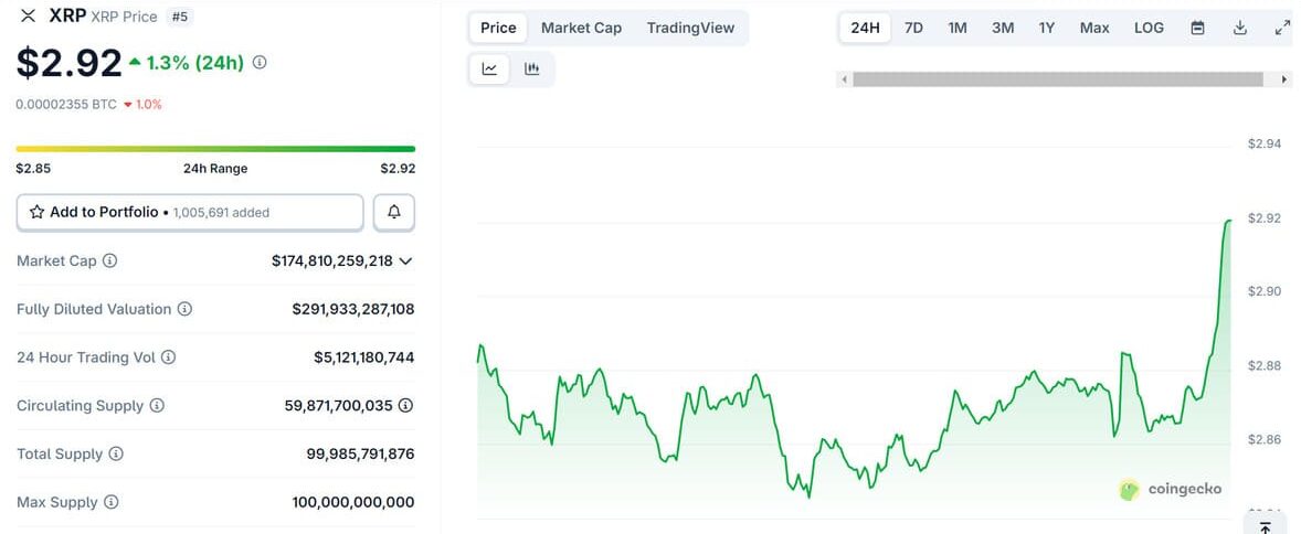 At the time of writing, XRP trades around $2.92, representing a 1% consolidation on its 14-day chart. XRP volumes are also up 1% over the past week, suggesting stable network activity.Ā