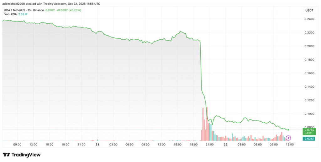 Despite this shutdown, Kadena’s decentralized proof-of-work network will continue to operate, maintained by independent miners and community developers. A final update is expected to ensure stability for the KDA price beyond Kadena’s exit. However, the KDA price has suffered immensely, plummeting by 60% in a single day to $0.089.