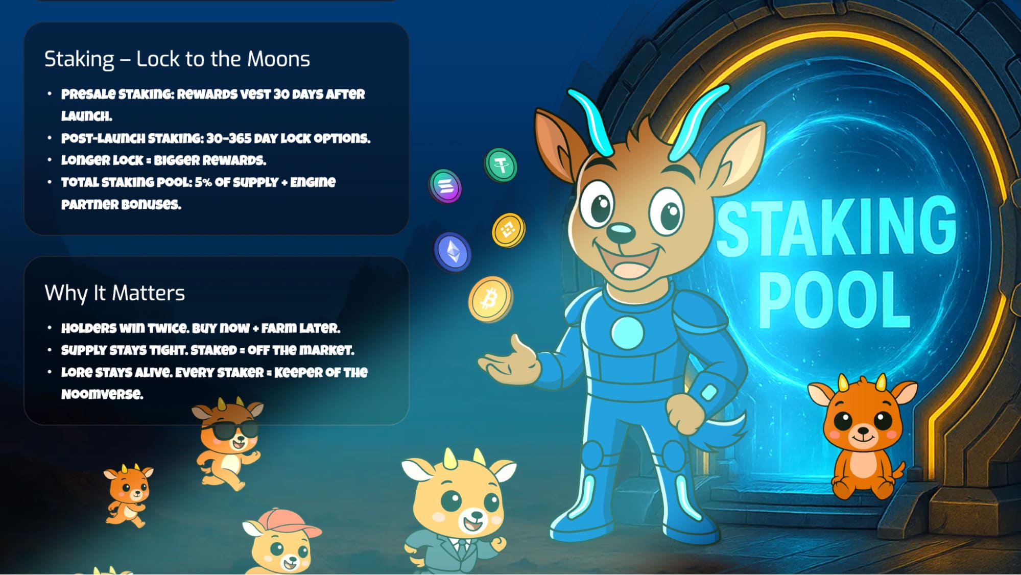 The Staking Pool draws from 5% of the total supply, plus bonuses distributed by the Noom Engine.