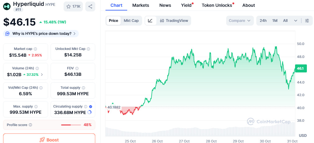 Additionally, trading volume has been rising—a 35% increase in the last 24 hours to $1 billion, according to CoinMarketCap. Bulls breaking above $50 will bolster investor confidence, potentially pushing the HYPE price past its September all-time high of $59.3.