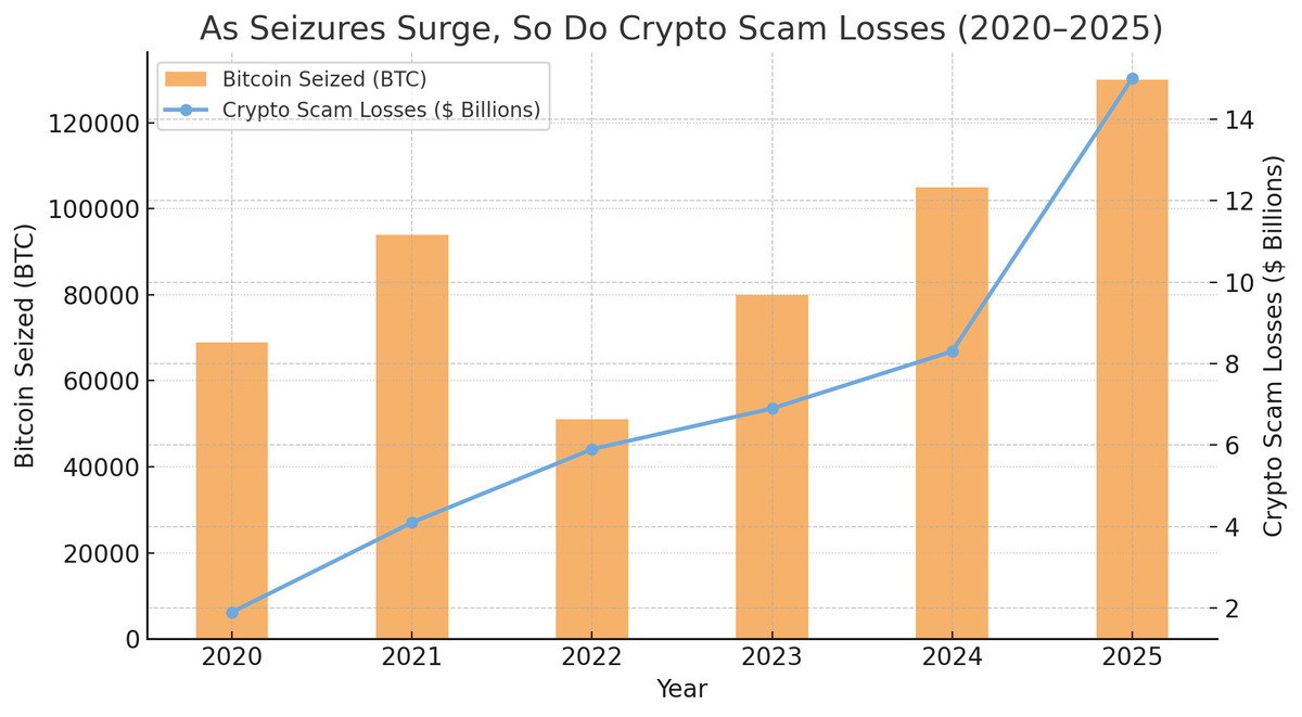 Authorities traced transactions across thousands of wallets, eventually freezing addresses that led to two major centralized exchanges. The operation, coordinated by Interpol, the FBI, and the U.K.’s National Crime Agency, seized nearly 130,000 BTC and dozens of luxury assets.
