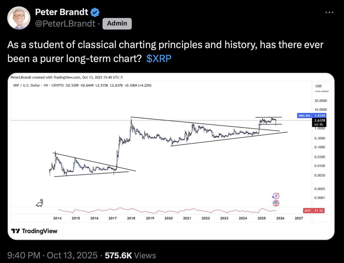 Peter Brandt, a veteran trader with nearly five decades of market experience, recently spotlighted the XRP price as a textbook example of long-term structural integrity. His multi-decade chart analysis showed XRP’s movement since 2014; from its explosive 2017 rally to the long compression that followed, asking if there’s ever a purer long-term chart.