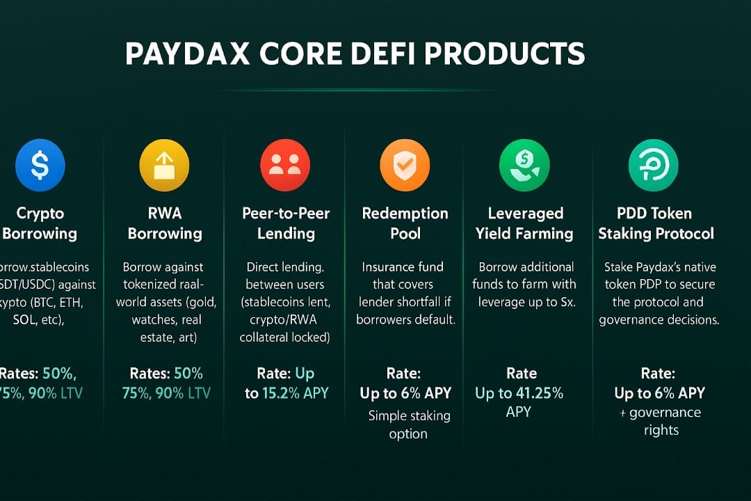 While banks burden people with endless paperwork, delays, and high rates, Paydax lets users borrow blue-chip cryptos like USDT or BTC in minutes. It supports 15+ types of collateral ā from governance tokens to real-world assets like gold, delivering a range that banks and other DeFi lending platforms canāt match.