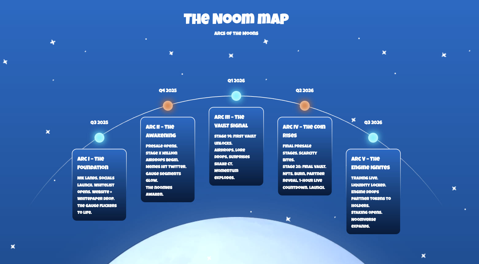 The Noom Map turns a roadmap into a live, measurable timeline that unfolds directly on-chain. It’s divided into five key arcs, each representing a milestone that pushes the Noomverse forward from the first signal to full market activation.